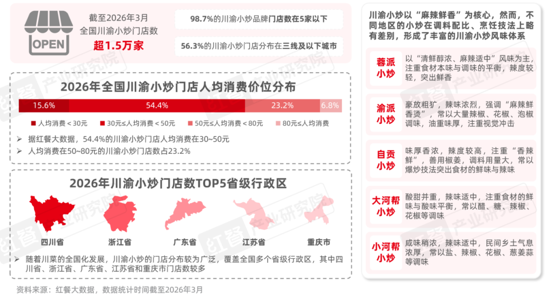 川渝小炒凭借“麻辣成瘾性强”以及川菜本身较高的市场认知度,近年来市场基础不断夯实,赛道规模稳步扩张。据红餐大数据,截至2026年3月,全国川渝小炒门店数超过1.5万家,其中56.3%的川渝小炒门店位于三线及以下城市。此外,尽管当前川渝小炒赛道已经诞生秋金川味小炒、周麻婆川渝小炒、张巴适爆炒川味三绝等连锁品牌,但赛道整体仍以夫妻店为主体,98.7%的川渝小炒品牌门店数在5家以下,整体呈现较为分散的竞争格局。