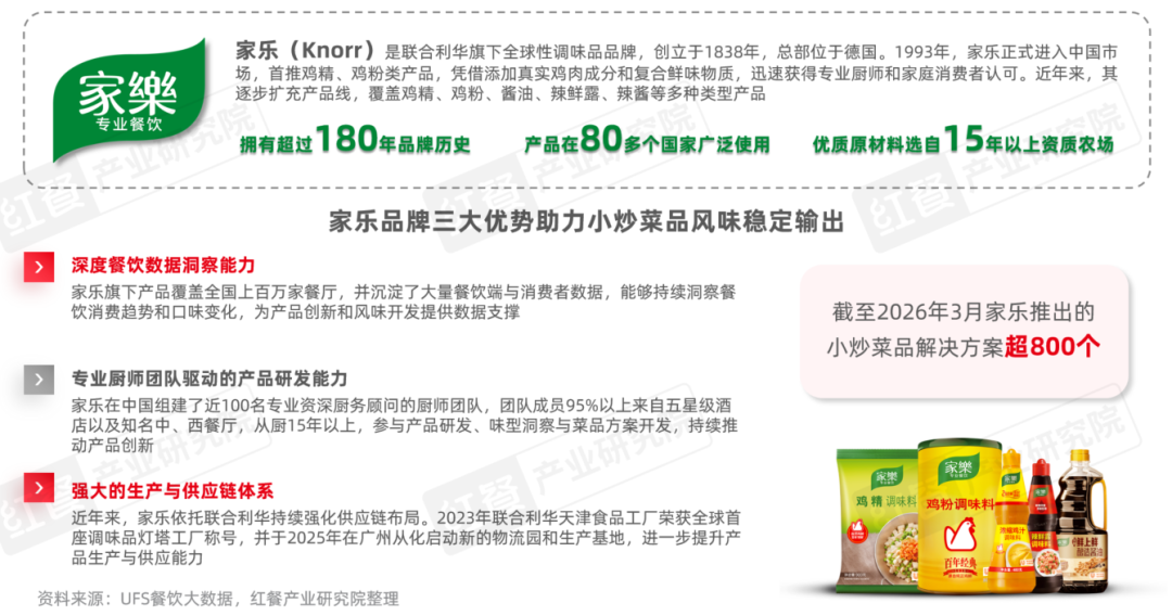 近年来,随着小炒热度持续攀升,家乐持续围绕小炒、快炒等中式烹饪场景,进行产品研发与风味研究,形成覆盖多种小炒菜品的调味产品体系。通过复合调味技术与标准化配方,家乐帮助餐饮门店在保持风味特色的同时,实现更稳定的菜品出品。