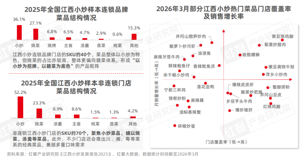 在此基础上,连锁化趋势也进一步推动了产品结构的优化与标准化。与传统小店相比,江西小炒连锁品牌通常控制在40个SKU左右,以小炒菜品为核心,搭配烧菜、烧烤、主食等菜品类型,形成高复购、高效率的标准化产品矩阵;而非连锁小店的SKU数量平均在70个左右,除江西小炒外,还融合川、湘、粤等菜系,推出酸菜鱼、毛血旺、水煮鱼等菜品,以多样性满足不同客群的口味偏好。