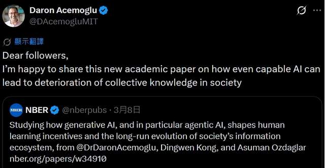 至于“AI会降低全社会的集体智识”,阿西莫格鲁说这种话的频率,比阿莫迪渲染AI末日的频率低得有限。