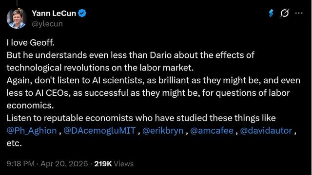 AI界的大宗师兼大网红杨立昆,指斥Anthropic老板达里奥·阿莫迪“不懂经济”、辛顿“比达里奥还不懂经济”,就如此走红了。