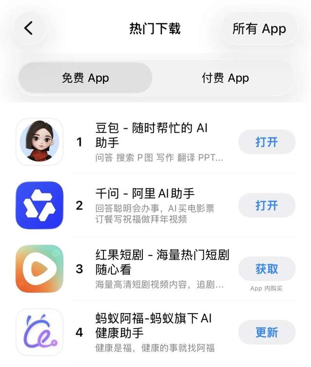 在用不完的AI新品、抢不完的AI红包中,互联网用户注意力空前分散,又空前聚焦。他们在千问、豆包、元宝等通用AI助手之间来回跳转。如果没有例外,春节期间苹果App Store应用下载榜前五名几乎要被通用AI助手包揽。
