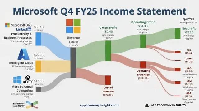 微软的战略是将AI嵌入到现金牛——用GPT武装Office全家桶,让企业办公变聪明;将Copilot打造为AI操作系统;用AI驱动Azure算力增长。近两年的财报表现持续验证了这一战略的「成色」:2025财年第四季度,人工智能为Azure的增长贡献了16%,市场预计2026年Azure毛利率将达到65%,超过AWS和Google Cloud。