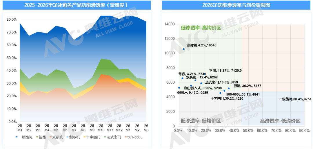 从产品趋势来看,当前主流技术的零售量渗透率已基本实现普及,例如风冷、一级能效等基础配置渗透率均达到 70% 以上,十字四门、法式四门、平嵌等形态化卖点虽未完全饱和,但也正处于快速渗透阶段。现阶段仍具备明显溢价能力的功能,主要集中在制冰机、双系统、零嵌等方向。但整体来看,冰箱行业尚未出现具备颠覆性、差异化的突破性技术,行业整体创新进入相对平缓的瓶颈期。