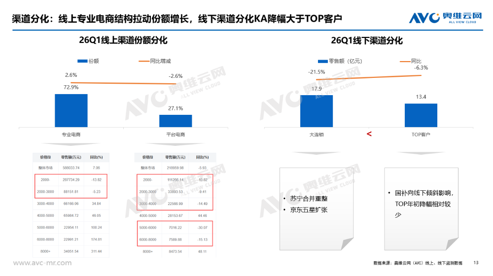 市场的分化特征在渠道层面表现得尤为显著。专业电商渠道份额2026Q1提升至72.9%,同比增长2.6%,这一变化主要得益于3000元以上价格段产品在该渠道占比的提升,显示出结构性升级对线上增长的拉动作用。而线下渠道则在政策驱动、驱动战略变动等多重因素影响下继续分化,大连锁零售额同比下滑21.5%,与之相比,TOP客户渠道降幅相对较缓,同比下降6.3%。