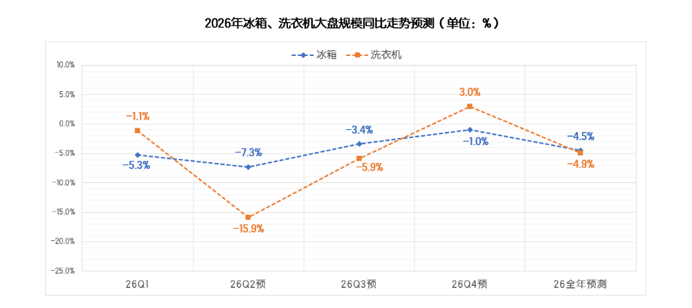 洗衣机产业:据奥维云网(AVC)预测数据,2026年全年洗衣机市场零售额预计同比下滑4.9%。受同期高基数影响,第二季度同比降幅或将进一步扩大,市场压力依然显著。但随市场节奏变化,预计降幅将从第三季度起逐步收窄,并在第四季度有望转正。