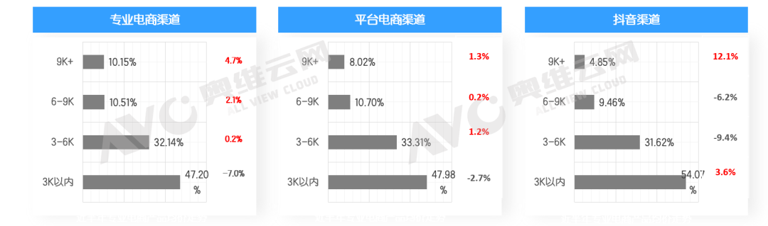 与之形成鲜明对比的是,抖音电商渠道呈现出明显的结构下行态势。尤其3K元以内低端价格段,2026年Q1季度该价位段占比同比大幅提升 12.1 个百分点。对于抖音这类流量成本与运营费率偏高的平台而言,产品结构快速下沉、高端占比持续萎缩,不仅会拉低整体客单价与盈利空间,也将对平台长期的品牌生态、利润水平与可持续发展产生不容忽视的冲击。