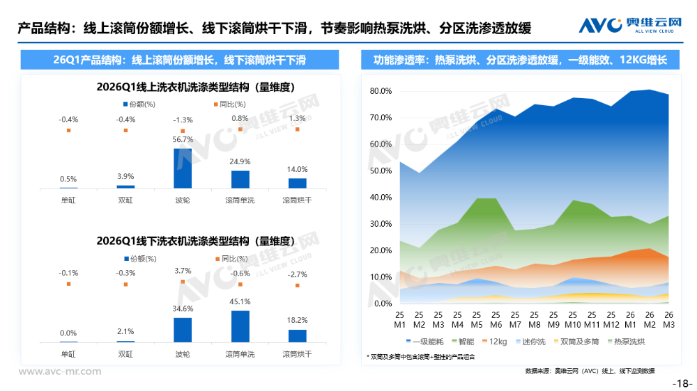 产品结构:线上滚筒份额增长、线下滚筒烘干下滑,节奏影响热泵洗烘、分区洗渗透放缓