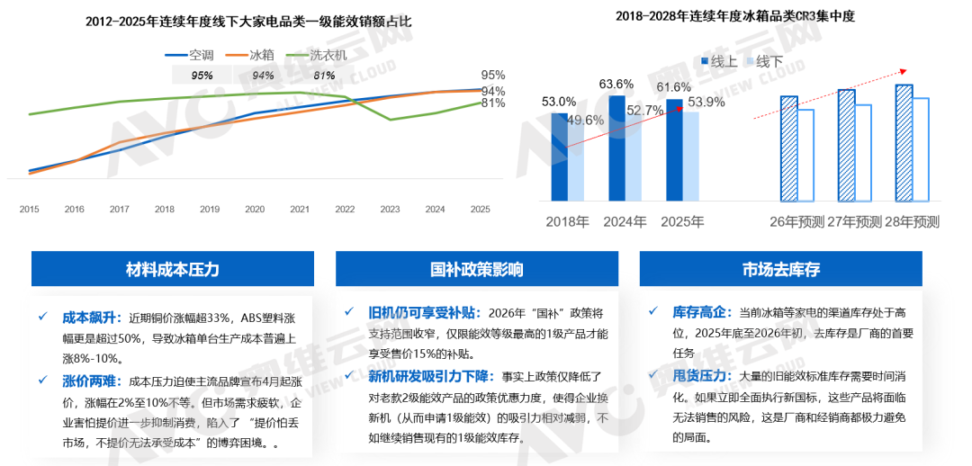 在能效标准方面,新版能效新规将于今年 6 月正式实施。此前行业普遍预计,新标准落地后,市场将快速完成新能效产品的迭代切换。但从当前行业实际运行情况来看,这一进程已明显放缓。一方面,企业正面临持续加剧的成本压力;另一方面,行业整体仍处于高库存去化阶段,叠加现行以旧换新国补政策,对非新标能效机型依旧给予补贴支持。多重因素共同作用下,企业研发、导入新能效产品的积极性明显不足。综合多方因素判断,新能效标准在终端市场的落地节奏将不及此前预期,新能效产品的规模化普及进程或将显著延后。