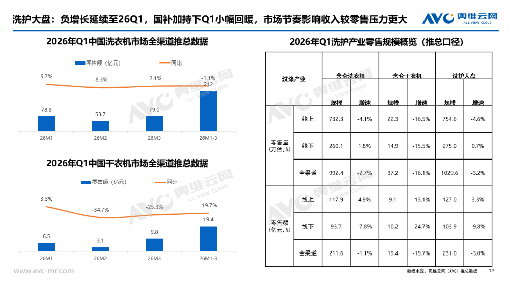 2026年的第一季度,中国洗护市场在“以旧换新”国补政策的延续中拉开序幕。据奥维云网(AVC)推总数据,2026年Q1中国洗衣机市场全渠道零售额为211.6亿元,同比降幅1.1%;干衣机市场表现承压更为明显,全渠道零售额为19.4亿元,同比降幅19.7%。尽管政策带来一定托底作用,市场较上一季度呈现小幅回暖,但同比下滑的压力仍然存在。尤其在同期收入高基数背景下,品牌端的收入压力并未得到明显缓解。
