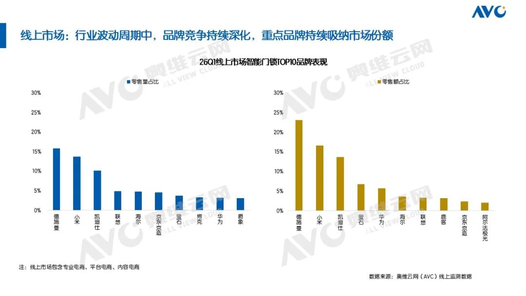 奥维云网(AVC)线上监测数据显示,2026年一季度,智能门锁线上渠道的零售量规模为154.8万套,同比下降13.7%;市场均价为960元,同比下降5%。受价格下调影响,零售额降幅进一步扩大,一季度线上市场零售额规模为14.9亿元,同比下降18.1%。