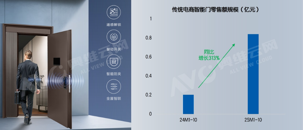 奥维云网(AVC)线上监测数据显示,2025年1-10月,传统电商平台门类零售中,符合“嵌入式一体化设计”定义的“智能门”产品,在亚太天能、云鹿、云掌门、王力、德雷克等主流品牌的积极推动下,零售额接近1亿元,同比2024年同期增长超过300%,这一高增长势头反映出智能门作为新兴品类,正在快速进入消费者视野。