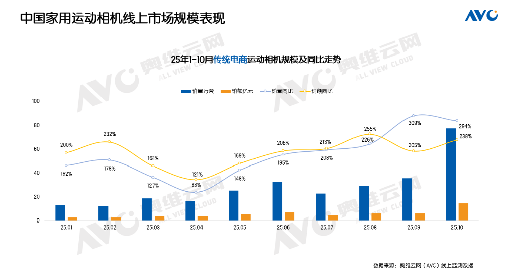 据奥维云网(AVC)线上监测数据显示,2025年1-10月,中国家用运动相机线上市场零售量达286万套,同比增长206%;零售额60亿元,同比增长203%。量额增速均超过200%。运动相机的快速增长并非单一因素驱动,而是技术突破、场景拓展、价格亲民与社交属性共同作用的结果。它从曾经的"极限运动专属装备",演变为如今的"生活记录神器",真正实现了"让每个人都能轻松记录精彩瞬间"的愿景。
