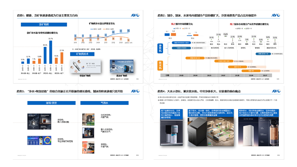 基于大数据分析,奥维云网指出,健康饮水产品已从“安全净化”向“健康赋能+细分场景解决方案”全面升级。产品创新呈现五大核心趋势:一是饮水健康化,矿物质净水器、饮水机等功能性产品快速崛起,2025年上1-11月含矿物质的净饮机占比已达55.7%,实现饮水口感与营养的双重提升,技术方面,主要以纳滤等核心技术,选择性过滤有害物质,保留矿物元素和通过RO过滤后添加天然矿石成分为主;二是场景适配多元化,针对家庭饮水场景推出覆盖泡茶、冲奶、制冰等多场景的净热一体机,顺应冰块需求的快速增长,市场渗透率持续攀升;三是功能复合化,“净水+附加功能”的组合创新正在开辟新的增长曲线,自制饮品场景正在成为行业增长的核心方向;四是大水小型化,针对90-120平米主流户型推出的“小体积、大流量”全屋净水设备,解决软水机、中央净体积大、安装难的核心痛点;五是单品套系化,长期来看,净水行业正逐步由单品向系统集成转型,全屋净水生态正在重构。
