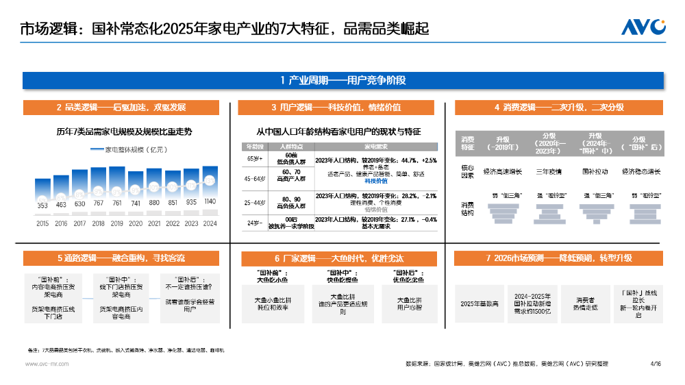 对于2026年市场走势,奥维云网(AVC)给出“降低预期、转型升级”的预判:国补政策在2024-2025年期间拉动新增需求约1500亿元,但受2025年高基数效应、消费者消费热情回落等因素影响,行业将开启新一轮内卷,转型升级成为企业破局的核心方向。