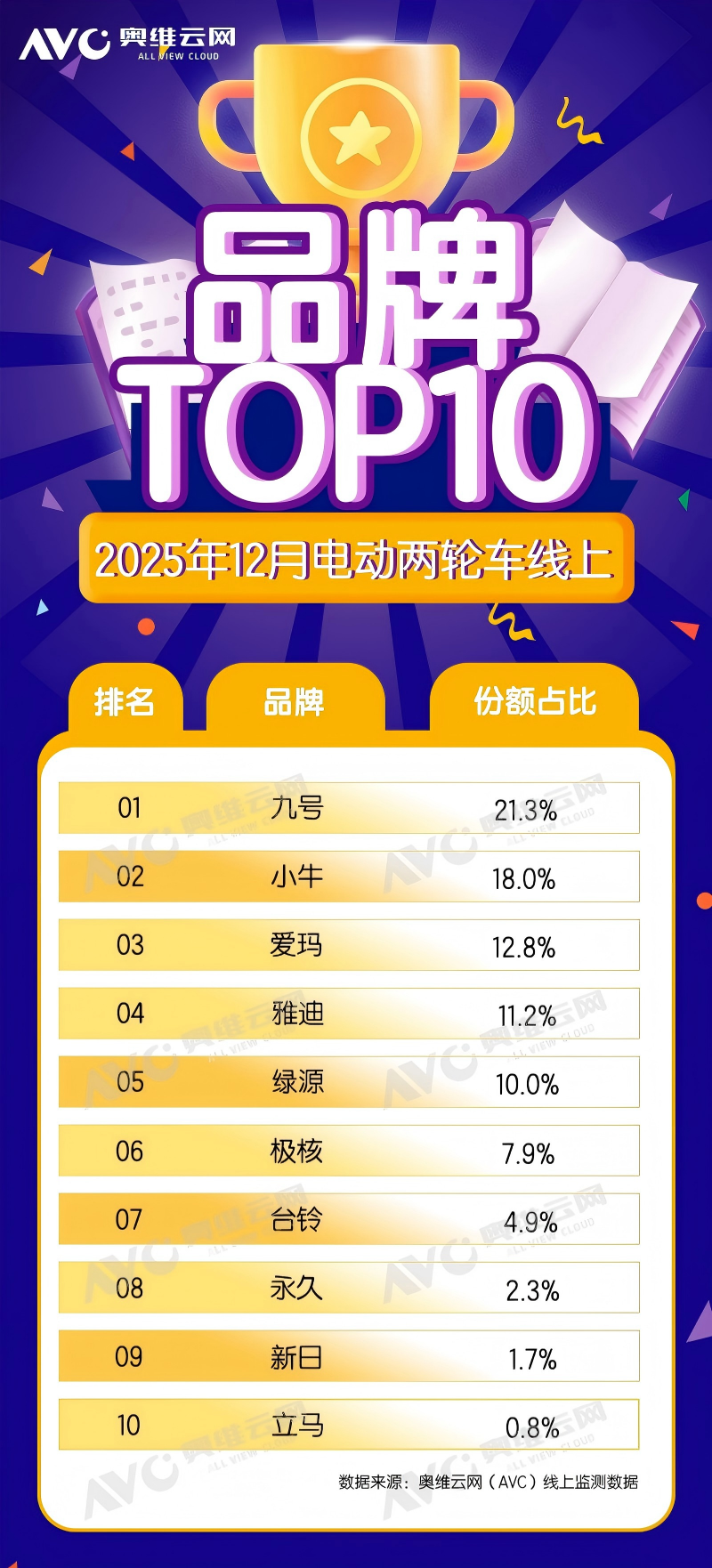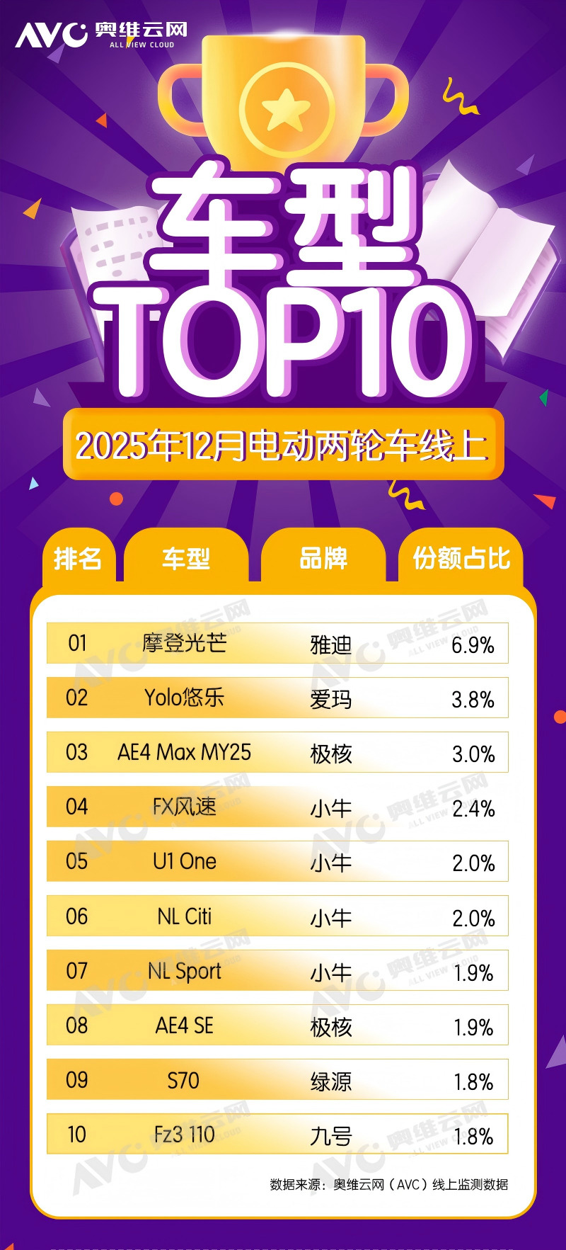 从线上零售监测数据看,2025年12月旧车型禁售、新新国标全面落地实施的首月,线上市场格局出现了符合预期但却深刻的变化。在当月线上销量排名中,九号与小牛依然占据前两位,这印证了其在智能化电动车领域的品牌心智与用户基础。然而,受新旧国标产品切换的直接影响,两大品牌的线上市场份额环比均出现了超过5个百分点的显著下滑。