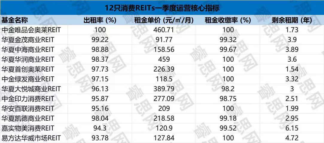 底层商业资产的经营成色,最终都会体现在常态化运营数据之上。出租率、租金单价、收缴效率、租赁周期四大核心维度,直观拉开了12只消费REITs的长期差距。