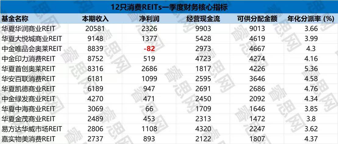 结合睿思网梳理统计数据,12只消费REITs一季度合计实现营收95217万元,头部单项目营收突破2亿元大关。板块经营现金流全部录得正向流入,合计规模达到45064万元,整体现金储备充足,安全垫扎实。与此同时,所有产品可供分配金额均为正值,板块平均年化现金流分派率4.23%,长期配置价值凸显。