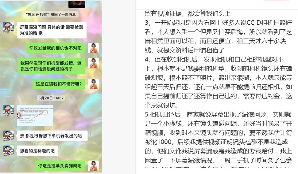 有网友表示,自己归还相机后只是机身有轻微掉漆,商家居然要索取540元的赔偿。还有在“花小猪租包”上租过LV包的网友表示,租了两次寄过来的包都不够新,第二次租完商家说寄回去的包爆皮了需要赔偿3000元,但他们寄过来时包就已经有爆皮痕迹了。