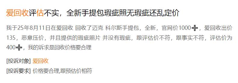 还有网友在“黑猫投诉”平台上反映其一款官网价1000多元的全新迈克·科尔斯品牌手提包,爱回收的出价却只有135元;该网友还表示爱回收提供的“瑕疵照片”根本与事实不符,另外平台当初评估价在400元以上。