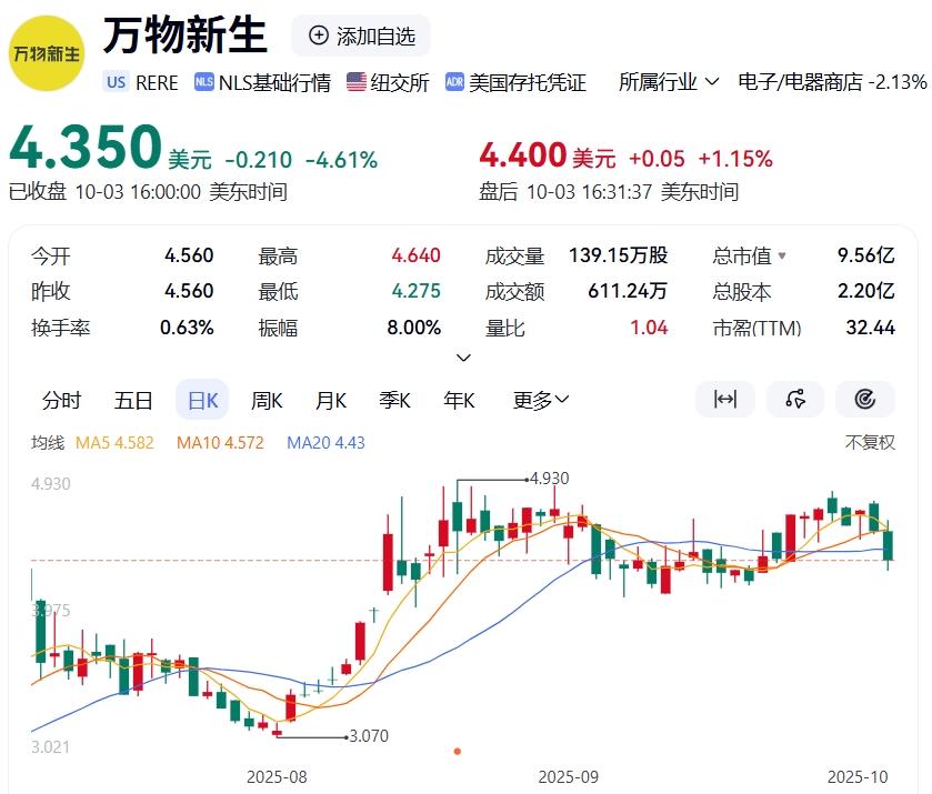 2021年6月18日万物新生上市当天,其股价上涨22.93%,超过18美元/股,总市值37.93亿美元;然而4年多过去,截至10月3日收盘,万物新生股价已然跌到4.35美元/股,较上市当天高点跌去近75%,当前总市值不足10亿美元。