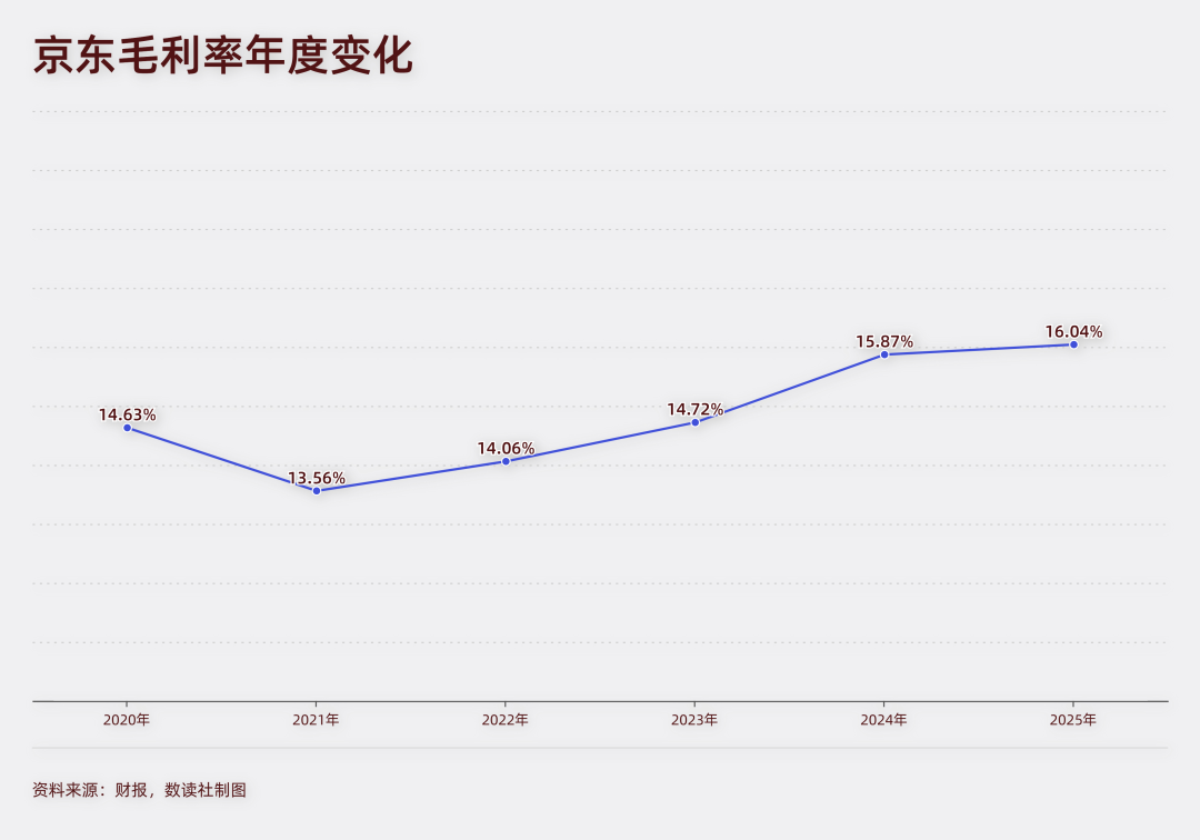 最近两年,随着日用百货营收占比的提升,京东已经把毛利率做到了15%以上,2025年达到了历史新高的16.04%。第三方的“收租模式”让京东有余力拿出钱来投入到外卖业务中。