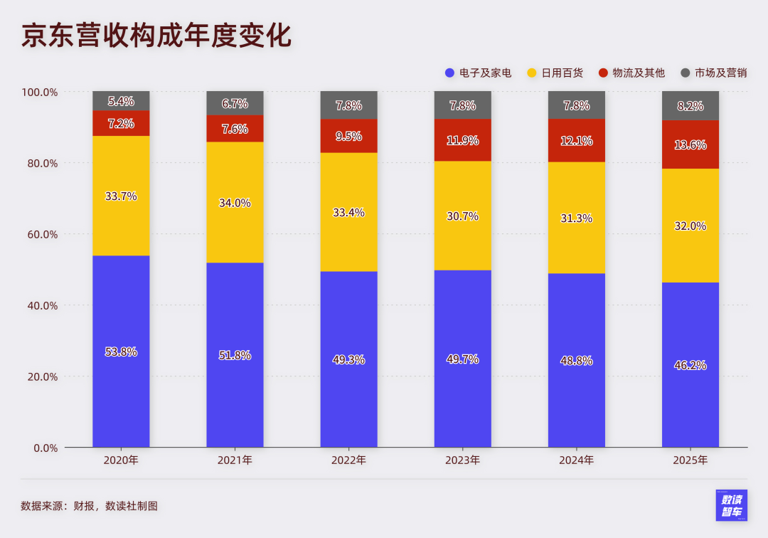 考虑到2026年,供应链问题导致3C普遍开始涨价,大概率会压制购买意愿,这项业务的比重可能还将下滑。京东的营收在接下来这一年,可能会进一步承压。