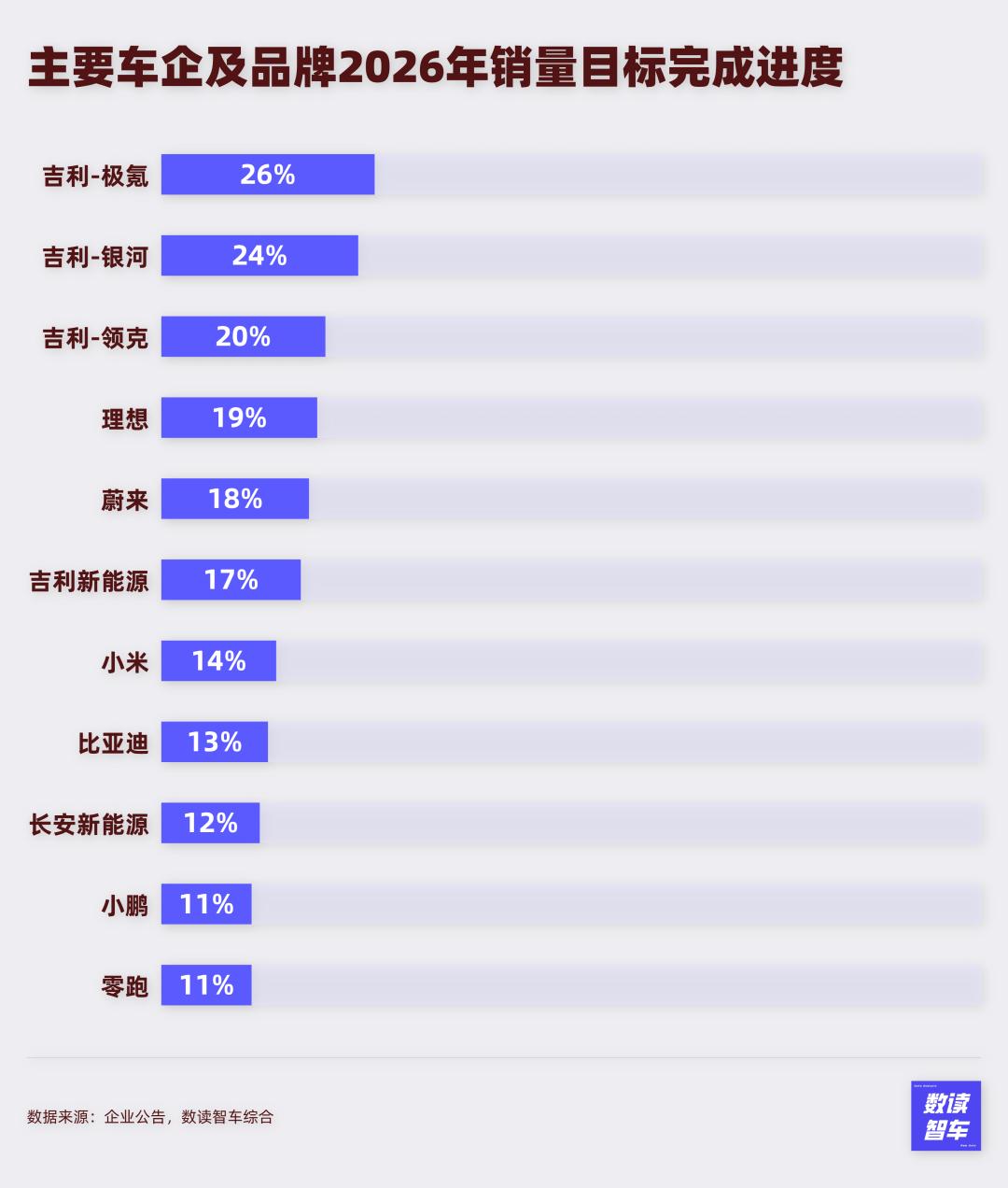 一季度的传统淡季,厂商指标完成进度往往比较慢。目前,吉利及旗下新能源品牌进度较为积极,极氪完成了26%,银河完成了24%,领克完成了20%。