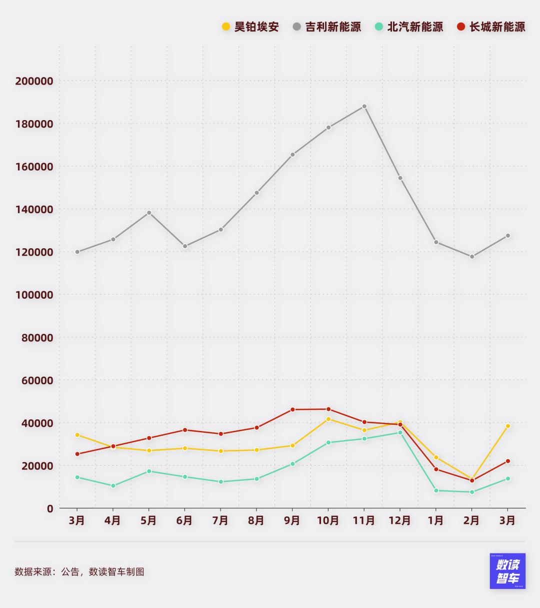 3月,头部车企的增长情况都不算积极。比亚迪下滑19.2%。上汽新能源销量下滑10%,吉利、长安、奇瑞只是个位数增长。