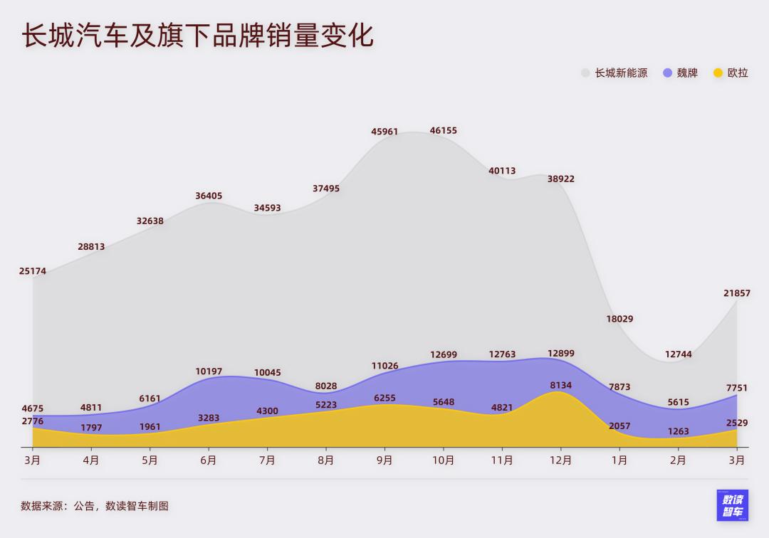主品牌哈弗的新能源转型缓慢,主要价格带,长城持续失守,导致其新能源在一季度平均销量只有1.75万台。