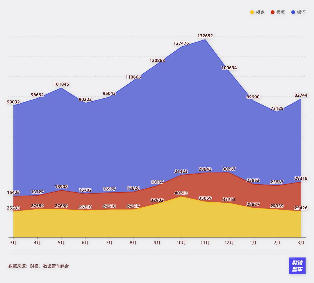 吉利是目前走得最稳健的车企。其格局主要“极氪+领克+银河”,银河稳住基本盘,领克卡位中端,极氪进军高端。一季度,银河表现极为稳定,平均月销接近8万,已经是比亚迪王朝、海洋之下最强势的品牌,牢牢稳住了基本盘。
