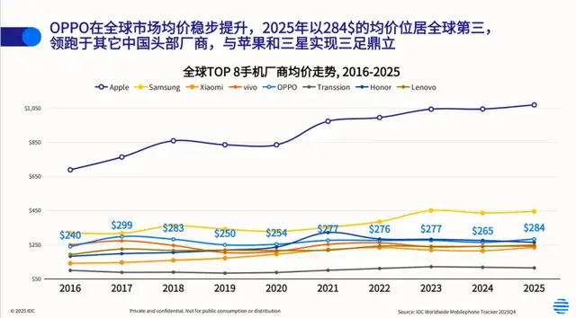 IDC数据显示,OPPO在2025年全球智能手机市场500-550$价格段位列第一,稳居全球高端智能手机市场第一阵营。2025年以284美元的均价位居全球第三,领跑中国头部厂商,与苹果和三星实现三足鼎立。过去十年OPPO累计份额全球第四,在中国市场保持第一。