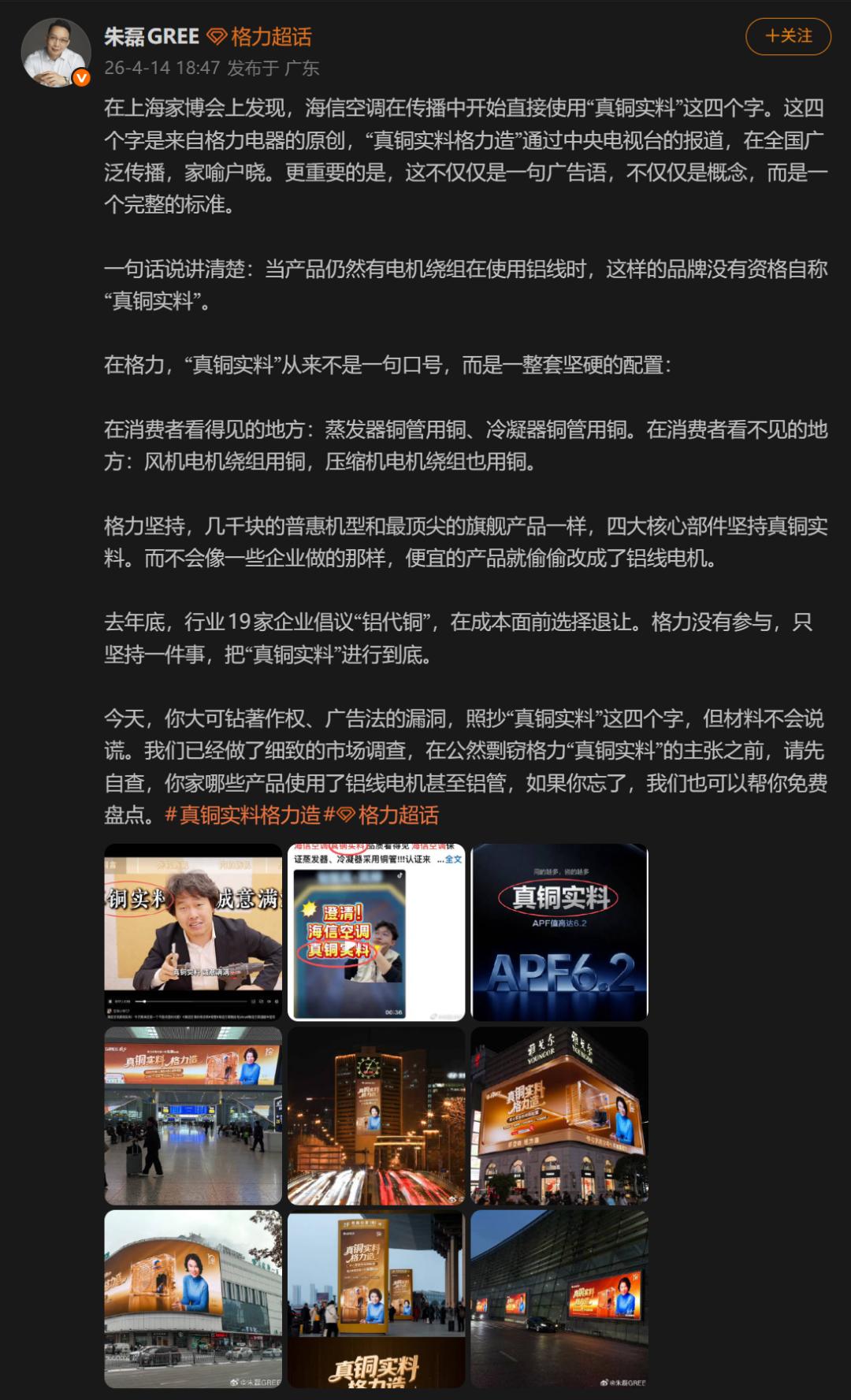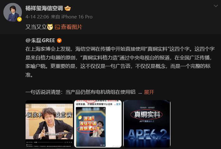 4 月 14 日上海家博会期间,格力电器CMO朱磊在微博发文,指名道姓指责海信空调在传播物料中直接使用“真铜实料”四个字,并称因海信部分产品电机绕组使用铝线,“没有资格自称真铜实料”。