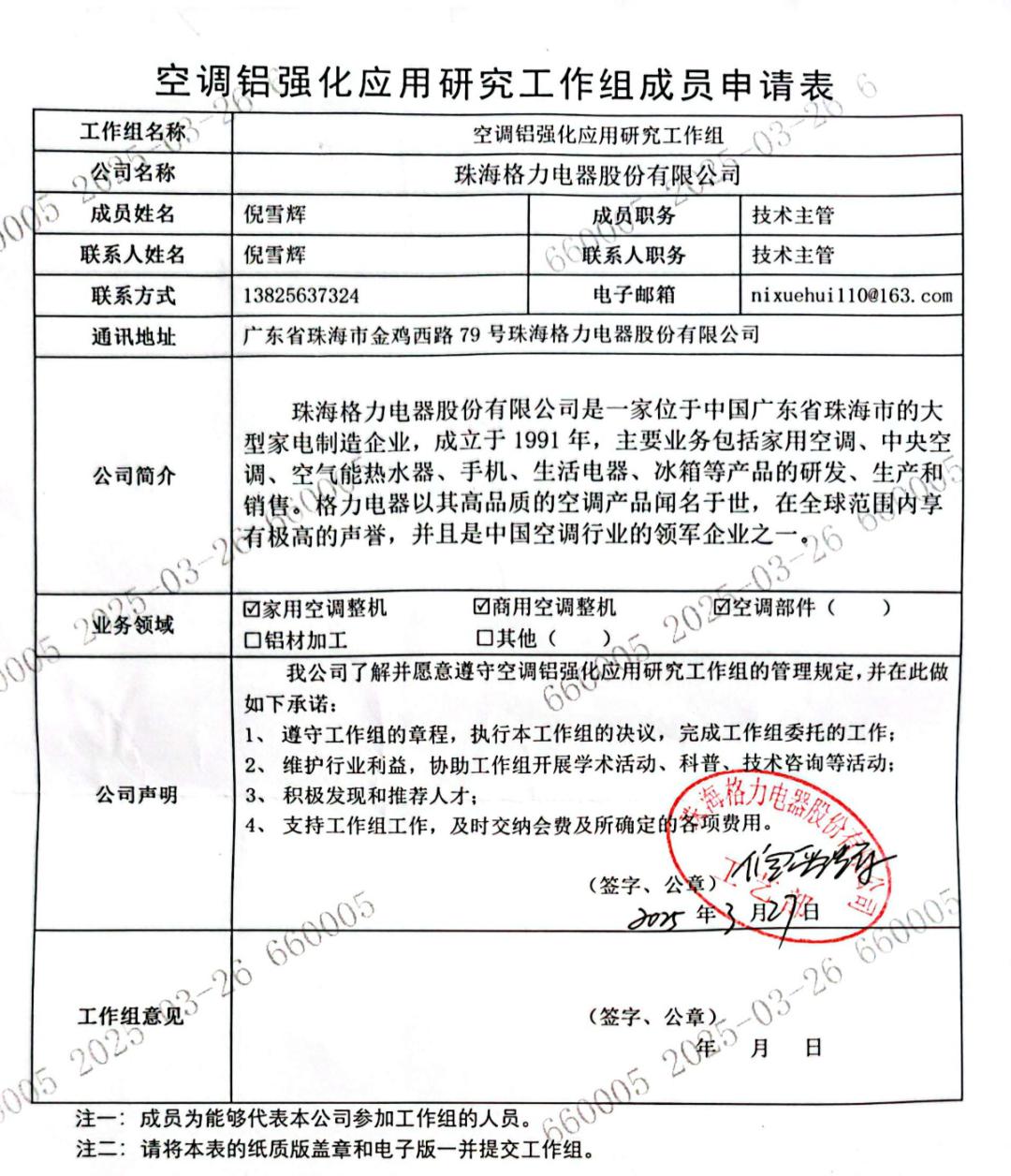 一天后,海信 30 周年庆典当日,海信空气事业部品牌总监杨祥玺迅速回怼,转发朱磊帖文并配文“又当又立”,晒出格力 2025 年 3 月申请加入“空调铝强化应用研究工作组”的申请表扫描件,指责格力言行不一。