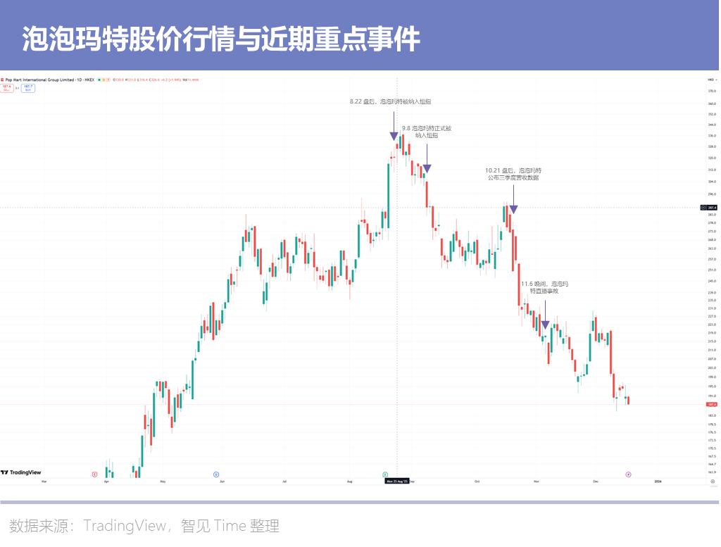 从被纳入恒指后迅速触达史高 339.6 港币/股到 12 月 15 日收盘的 190.7 港币/股,泡泡玛特股价已经跌去了 43.8%。