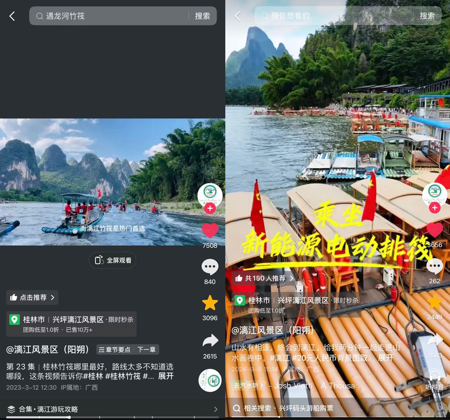景区近两年营销与销售主阵地转向抖音等平台,有意围绕“竹筏工”作为亮点放大。兴坪渔村果断抓住这个机会,鼓励自己村子的竹筏工积极配合景区短视频内容拍摄,用真实、鲜活的漓江竹筏工现场感内容,吸引游客。