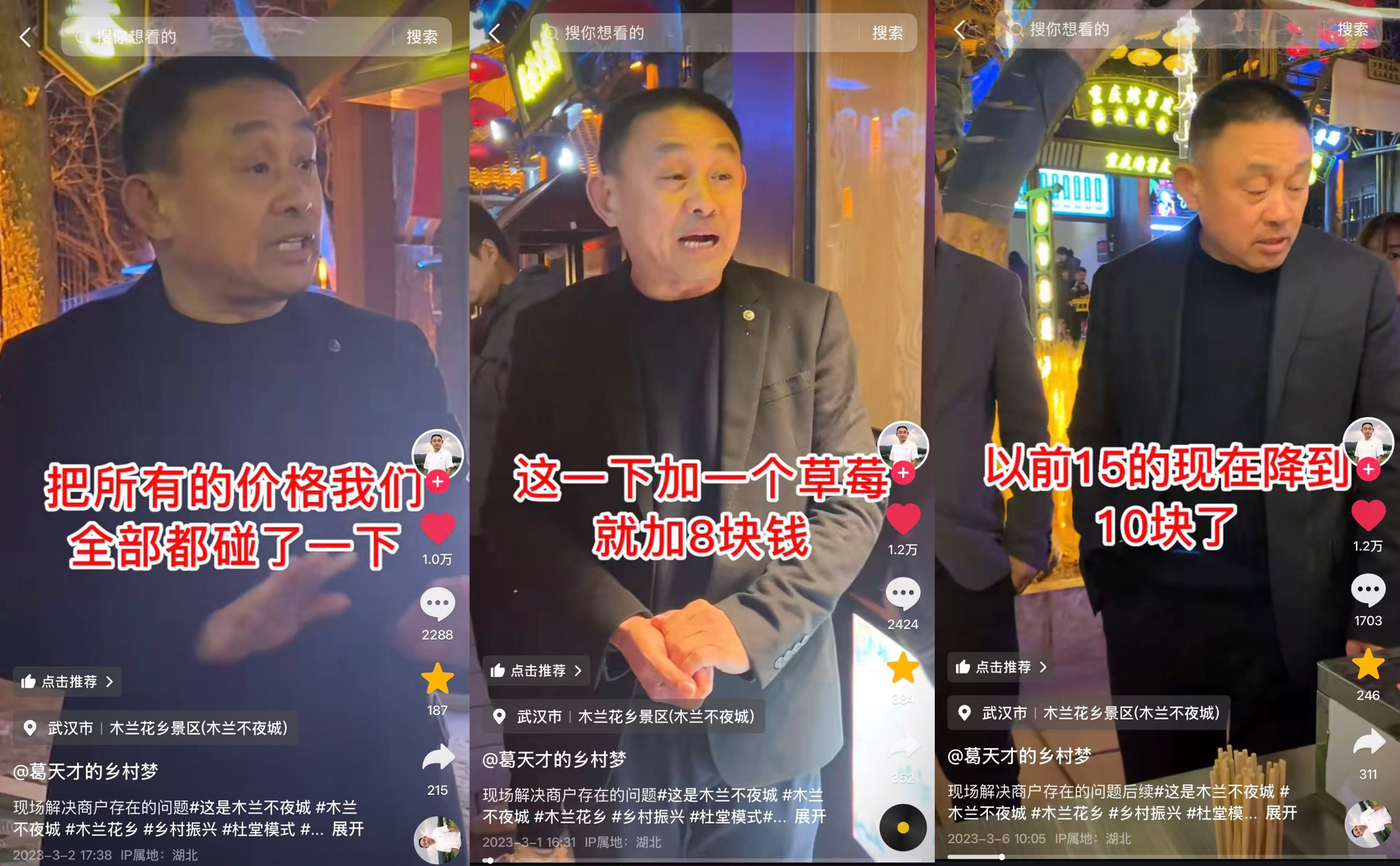 木兰不夜城开业不久,葛天才在抖音上浏览游客评论时发现,超过70%的游客都在吐槽景区商户物价过高,差评一片,这让他坐不住了。他赶紧在景区内挨家商户核查,并通过大量市场调研确认自家景区商户物价的确存在虚高问题。