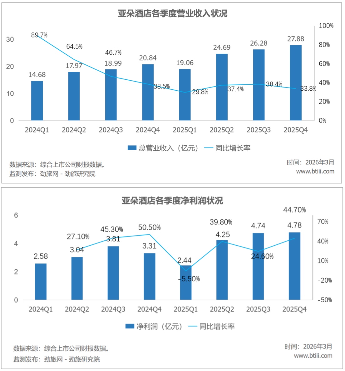 3月17日,亚朵发布2025年四季度及全年报告。根据报告,亚朵4季度实现营业收入27.88亿元,同比增长33.8%。归属于上市股东的净利润4.78亿元,同比增长44.70%。