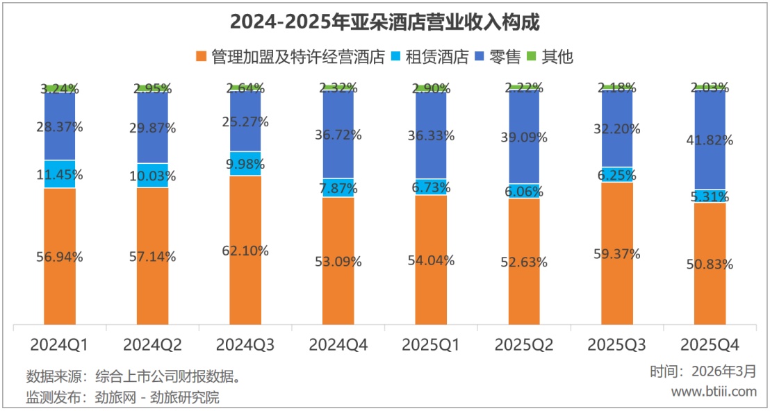 2025年全年零售收入36.71亿元,同比增长67%,占总收入的比例从30.3%升至37.5%,不只是规模大,质量也在改善,零售成本率从50.4%降至47.4%,毛利率反而在提升,这对一个做酒店起家的公司来说,有点反客为主的意思。