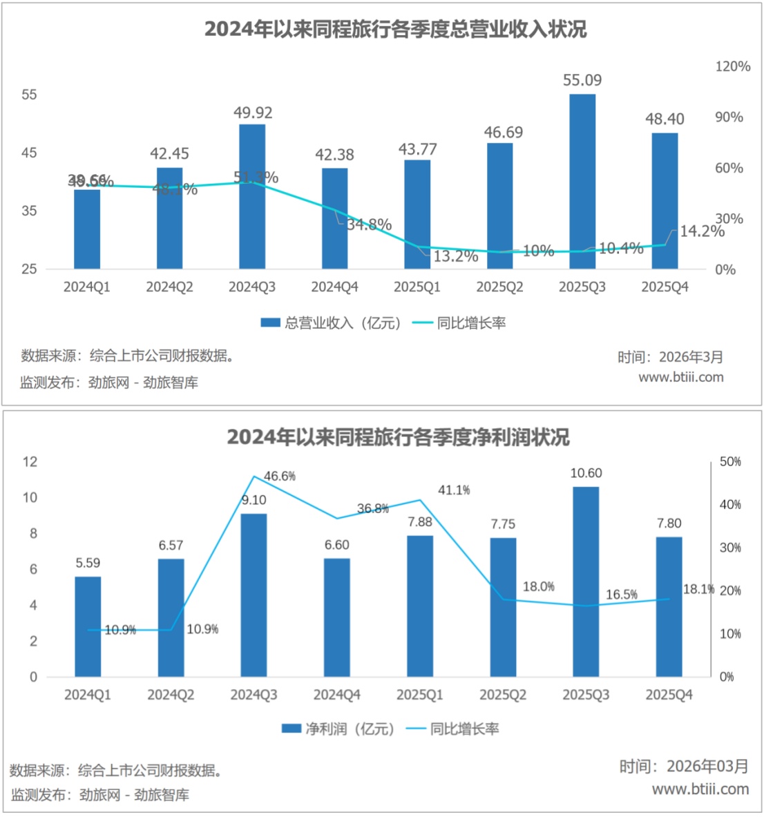 近日,同程旅行发布2025年报告。根据报告,同程旅行四季度营业收入48.40亿元,同比增长14.2%。净利润7.80亿元,同比增长18.1%。全年营收 193.96 亿元,同比增长 11.9%;净利润 34.03 亿元,同比增长 22.2%。
