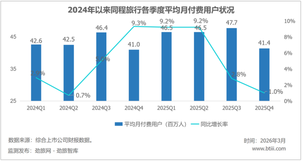 第一,增速在明显放缓。2024年收入同比增速是45.8%,2025年一下子掉到11.9%,少了34个百分点,用户增长也是同样的状况,年付费用户增速从两位数掉到6.0%,流量红利期过去了,同程正在进入一个更高基数的较高增长阶段。