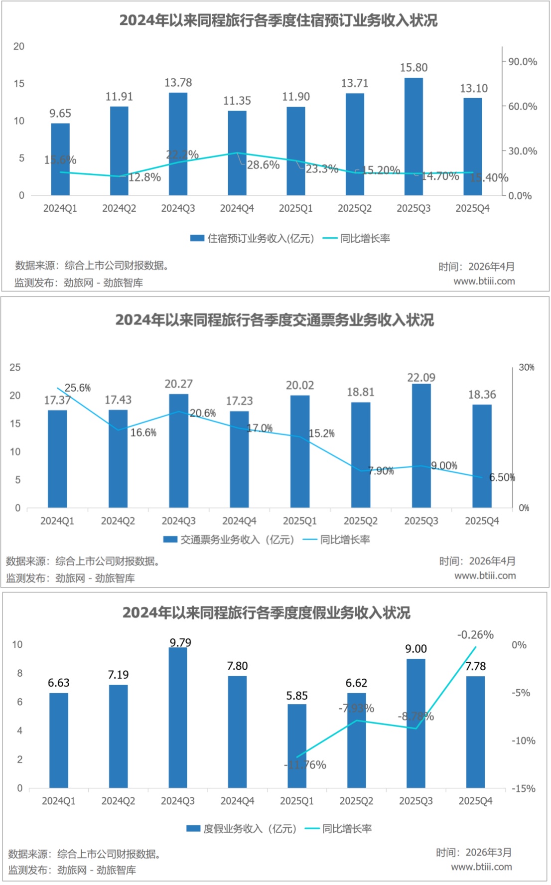 其中,住宿预订业务营业收入13.10亿元,同比增长15.4%。交通票务业务营业收入18.36亿元,同比增长6.50%。度假业务收入7.78亿元,同比下降0.26%。