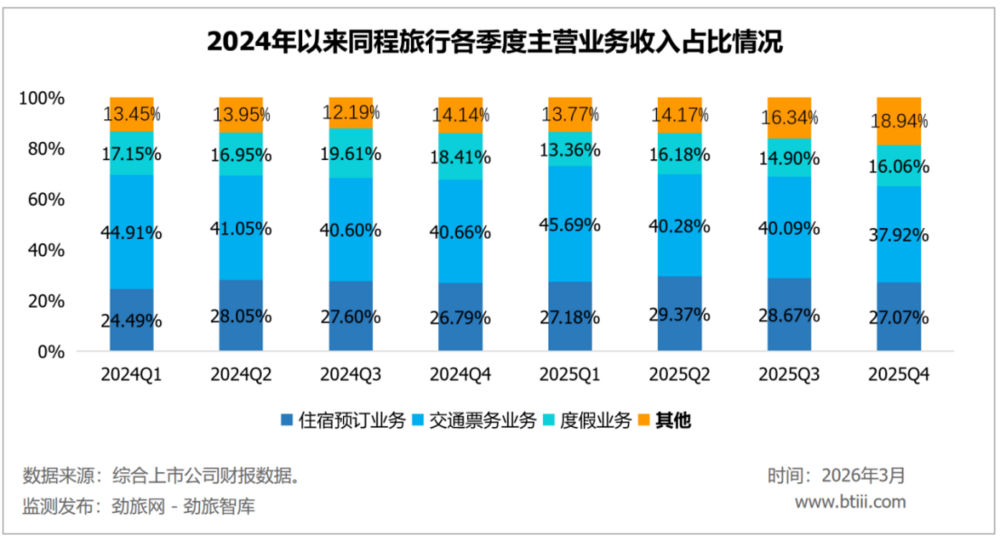 主营业务中,住宿预订业务、交通票务业务、度假业务占总收入比重分别为27.07%、37.92%、16.06%。