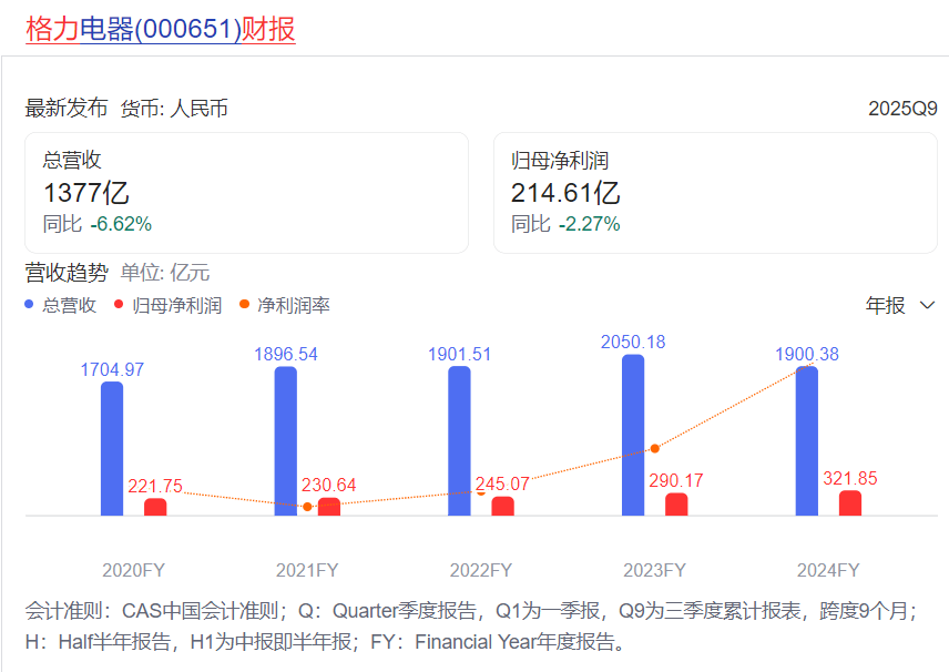 然而,全行业稳步增长的背景下,2025年三季报显示,格力电器营业总收入1376.54亿元,同比下降6.62%;归母净利润214.61亿元,同比下降2.27%。