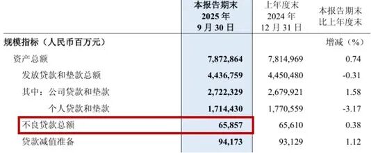 信用减值损失的增长,直接源于资产质量的恶化。截至2025年9月末,该行不良贷款总额658.57亿元,较上年末增加2.47亿元;不良贷款率1.48%,较上年末微升0.01个百分点,在已披露数据的上市股份银行中仅优于华夏银行。