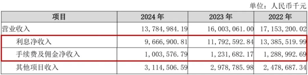 从收入端看,核心的利息净收入2024年降至96.67亿元,同比下滑18.03%,净息差仅1.35%,低于商业银行1.52%的行业平均水平;手续费及佣金净收入10.04亿元,同比下滑18.52%,信用卡业务收缩成为主要拖累因素。