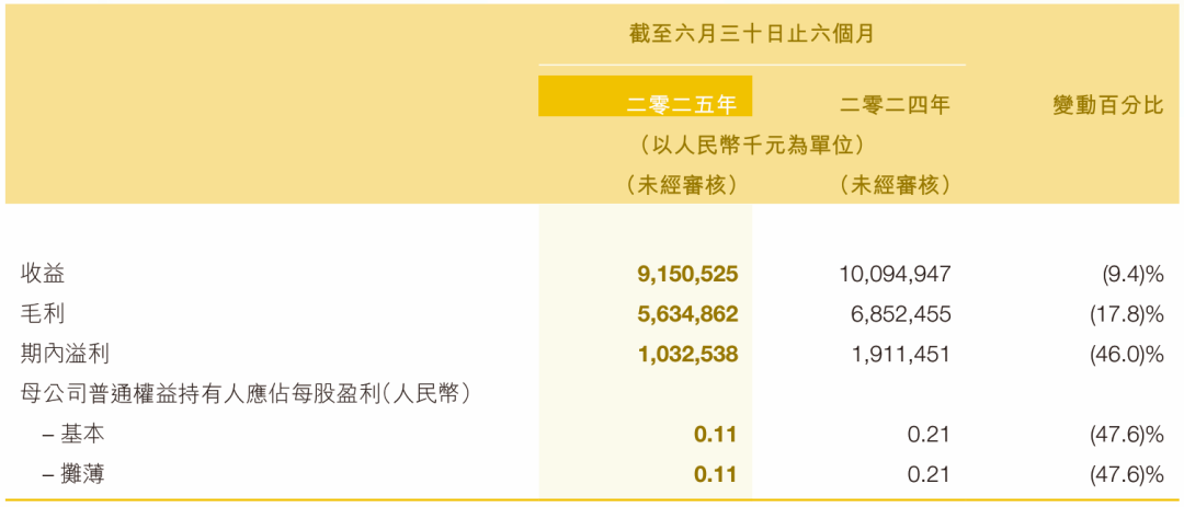 四年后,也就是2025年7月,同样是这块交易屏幕前,飞鹤股价已经下跌到4.5港元/股,相比于巅峰时期下跌近八成市值。而2025年半年报更是给市场当头一棒——营收同比下滑9.4%,净利润更是近乎腰斩下降46%。