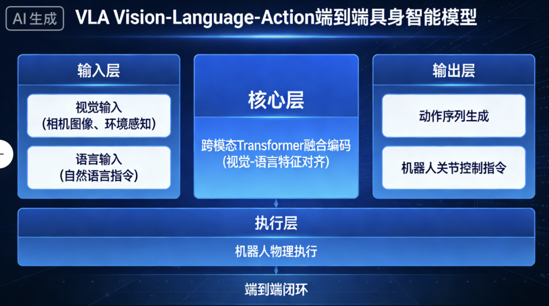 行业曾形成明确共识:人形机器人的能力突破离不开端到端VLA(Vision-Language-Action,视觉-语言-动作)架构的核心驱动。这种通过融合视觉感知、语言理解与动作生成三大模态,打破了传统“感知- 规划 - 控制”分层架构的信息损耗难题,实现端到端闭环。