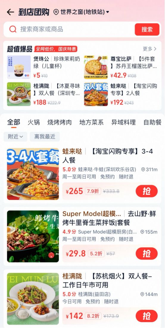 (图六,深圳世界之窗地铁站附近的淘宝闪购到店团购套餐,来源淘宝app)