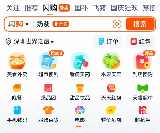 (图一,到店团购在淘宝APP闪购频道与外卖、便利等业务并列,来源淘宝app)